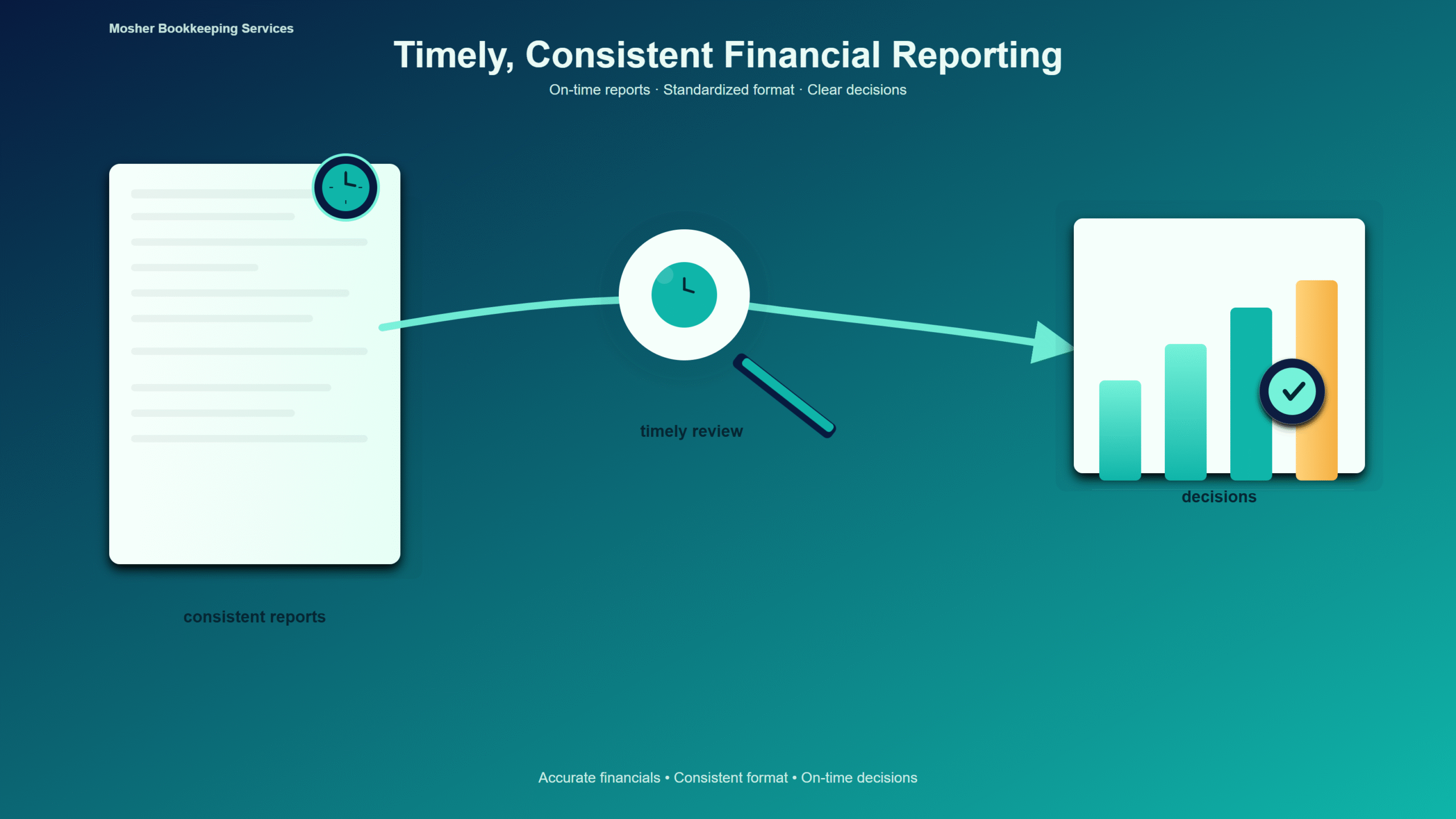 We deliver timely, reliable—and consistently produced—financial reports so you always know where the business stands. Each report follows the same schedule, format, and chart of accounts so numbers compare cleanly across periods. With repeatable close checklists, automated feeds, clear visuals, and concise next steps, our reports eliminate surprises, speed decisions, and build trust with your team, lenders, and partners.